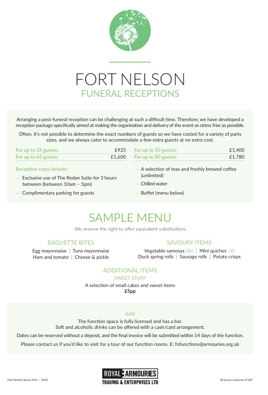 Experienced staff will be on hand to provide support before and during the event to ensure the delivery of the required services and facilities. It is possible to include a special gun salute using one of the big guns on The Parade. There are a variety of food and beverage options available to suit all tastes, using only the freshest of ingredients and preparing everything on site to the highest standards. The Redan has a relaxed peaceful atmosphere and is the ideal location for your wake buffet or lunch as you reminisce.